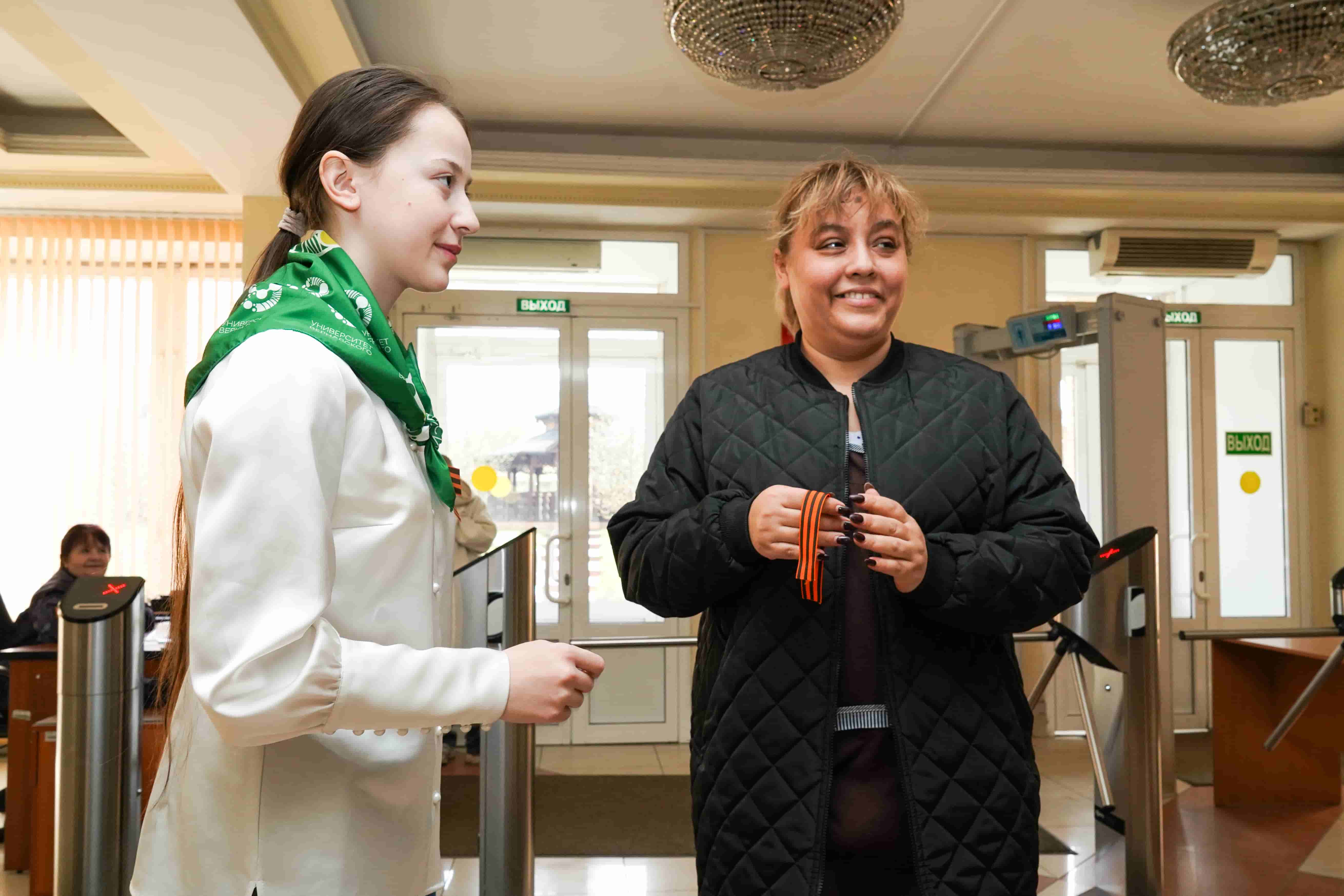 Масштабное мероприятие стартовало сегодня одновременно в российских регионах и 30 зарубежных странах. В главном корпусе вуза волонтеры раздавали георгиевские ленточки - символы воинской славы, студентам, преподавателям и сотрудникам университета.